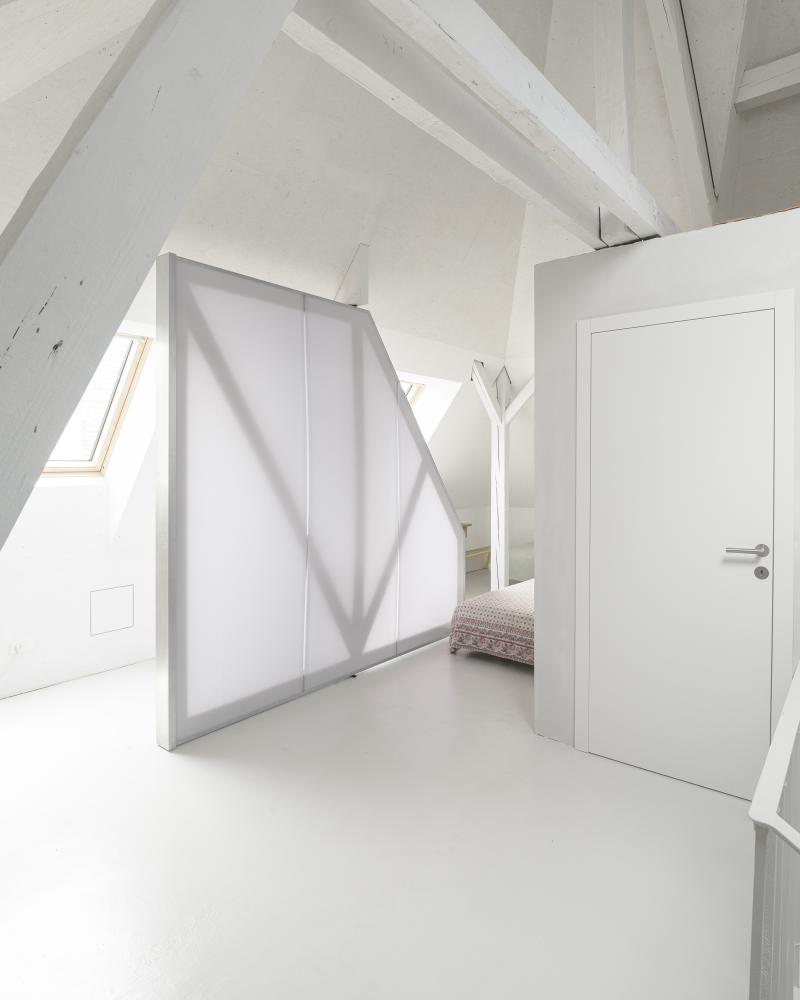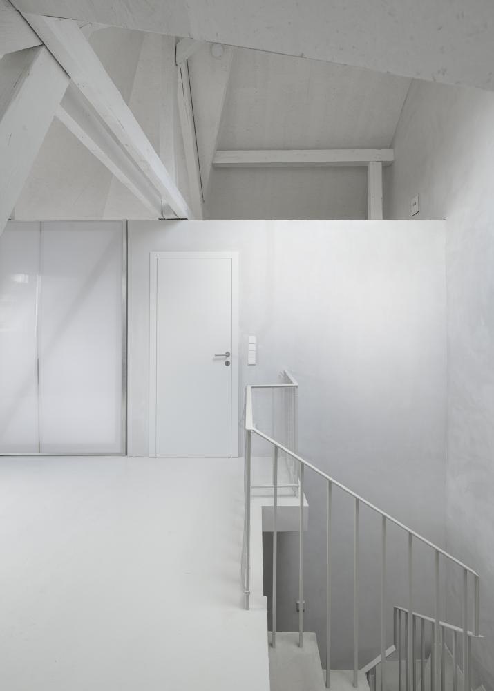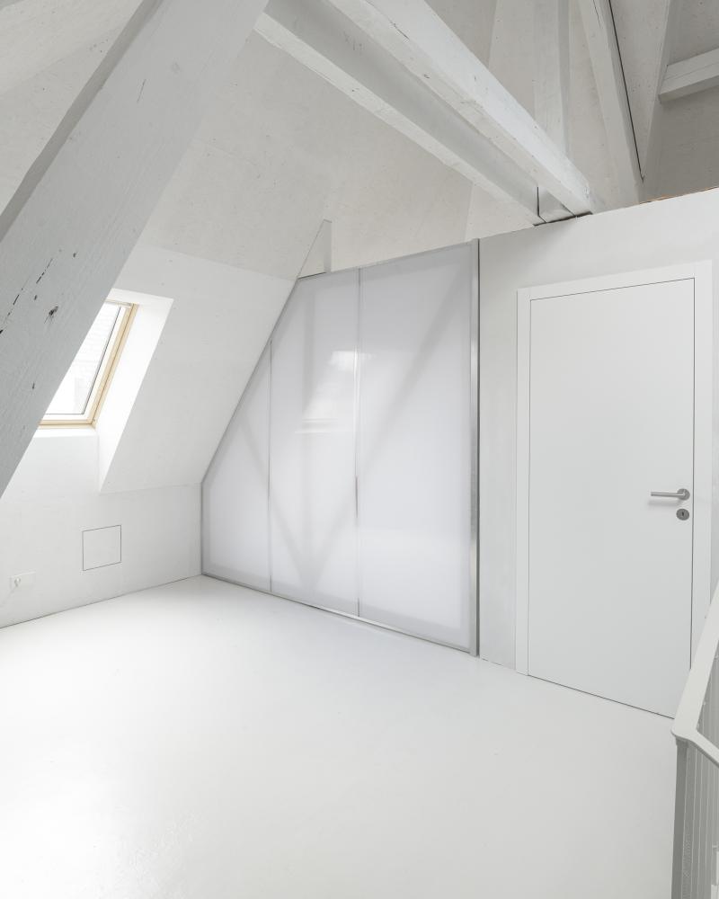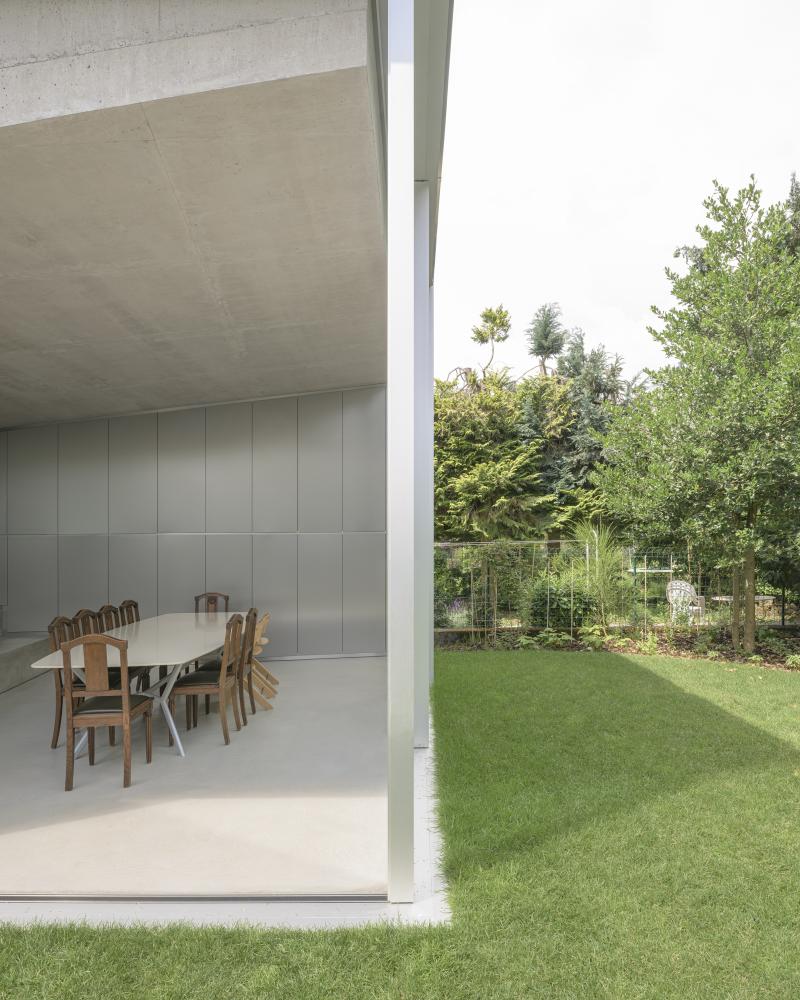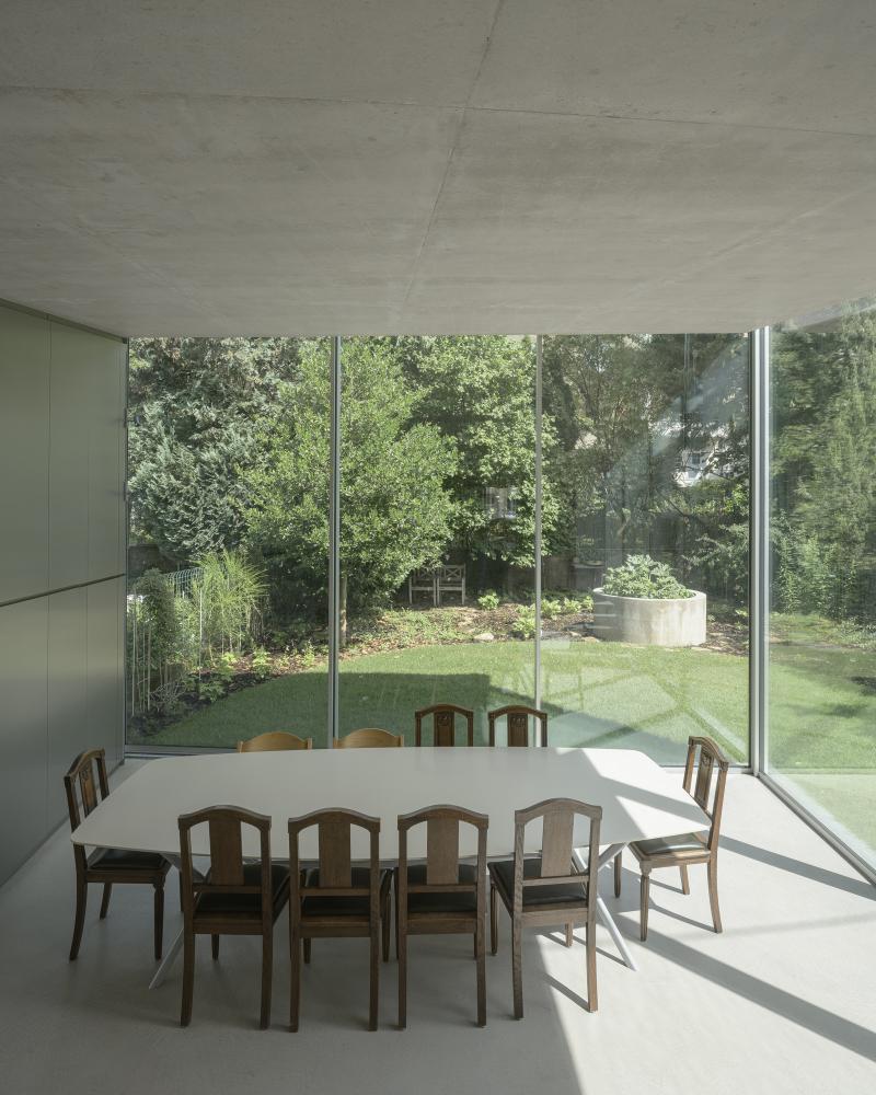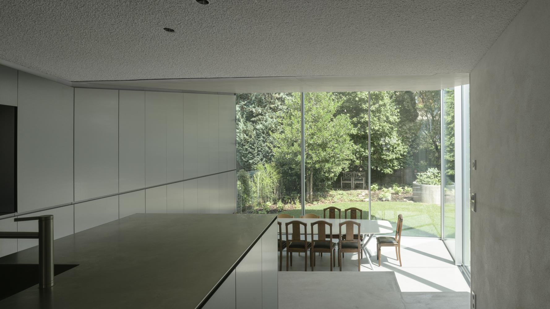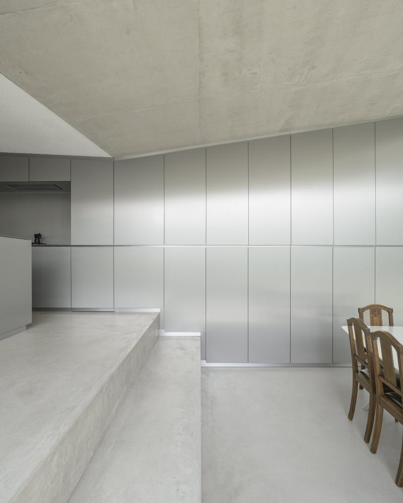 Like a crocodile opening its mouth wide, the house stretches out toward the north-facing garden, both in plan and in section. Sloped ceilings accommodate technical systems and resolve structural challenges, while the plan integrates kitchen fittings and secondary functions (storage, toilet) with subtle precision. What remains is a clean, open space, culminating in a lush, private garden, sheltered beneath a hovering concrete volume.