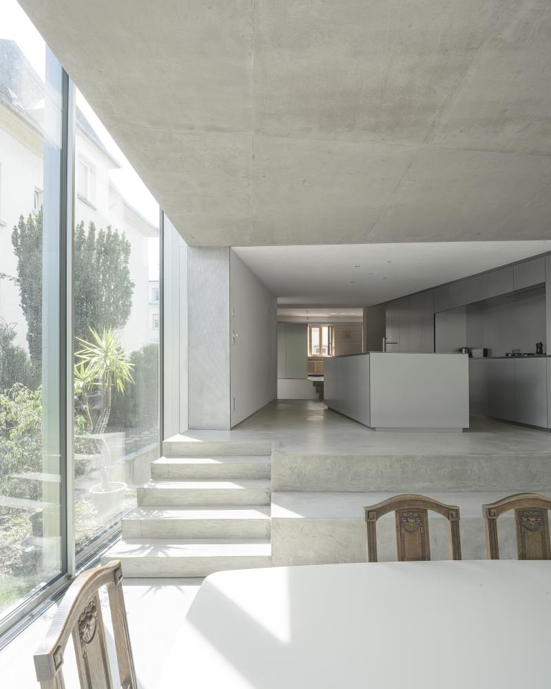The modest terrace and winter garden were removed, along with a portion of the rear floor slab. In their place, a simple cubic volume was inserted. Inside, the new floor was articulated as a sequence of three stepped levels; descending from the living room, through the kitchen, and down to a dining and second living area on the garden level.