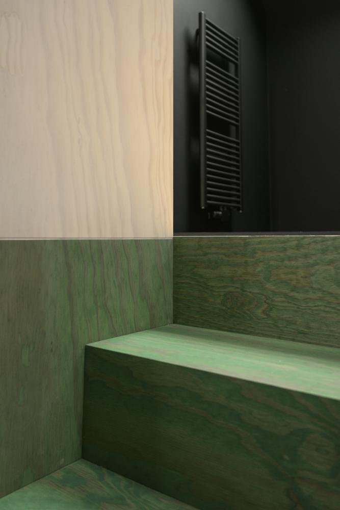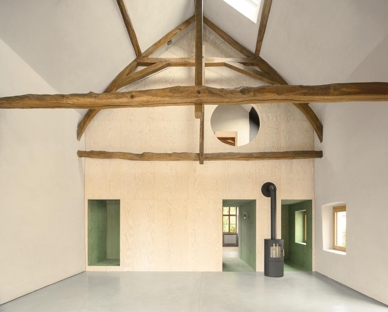 A passage was carved through the load-bearing wall that once divided barn and office. This newly opened tunnel, lined in green-tinted plywood, leads into the main living area; an expansive, 4-to-8-metre-high volume in the barn. The space, rendered in clay, showcases the original timber roof structure, now carefully reinforced by the engineers.